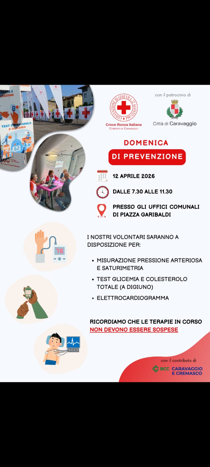 Croce Rossa Italiana, Comitato di Caravaggio, con il patrocinio della Città di Caravaggio, organizza la Domenica di prevenzione, che si terrà domenica 12 aprile dalle ore 7:30 alle 11:30 presso Palazzo Gallavresi, sede del Municipio.