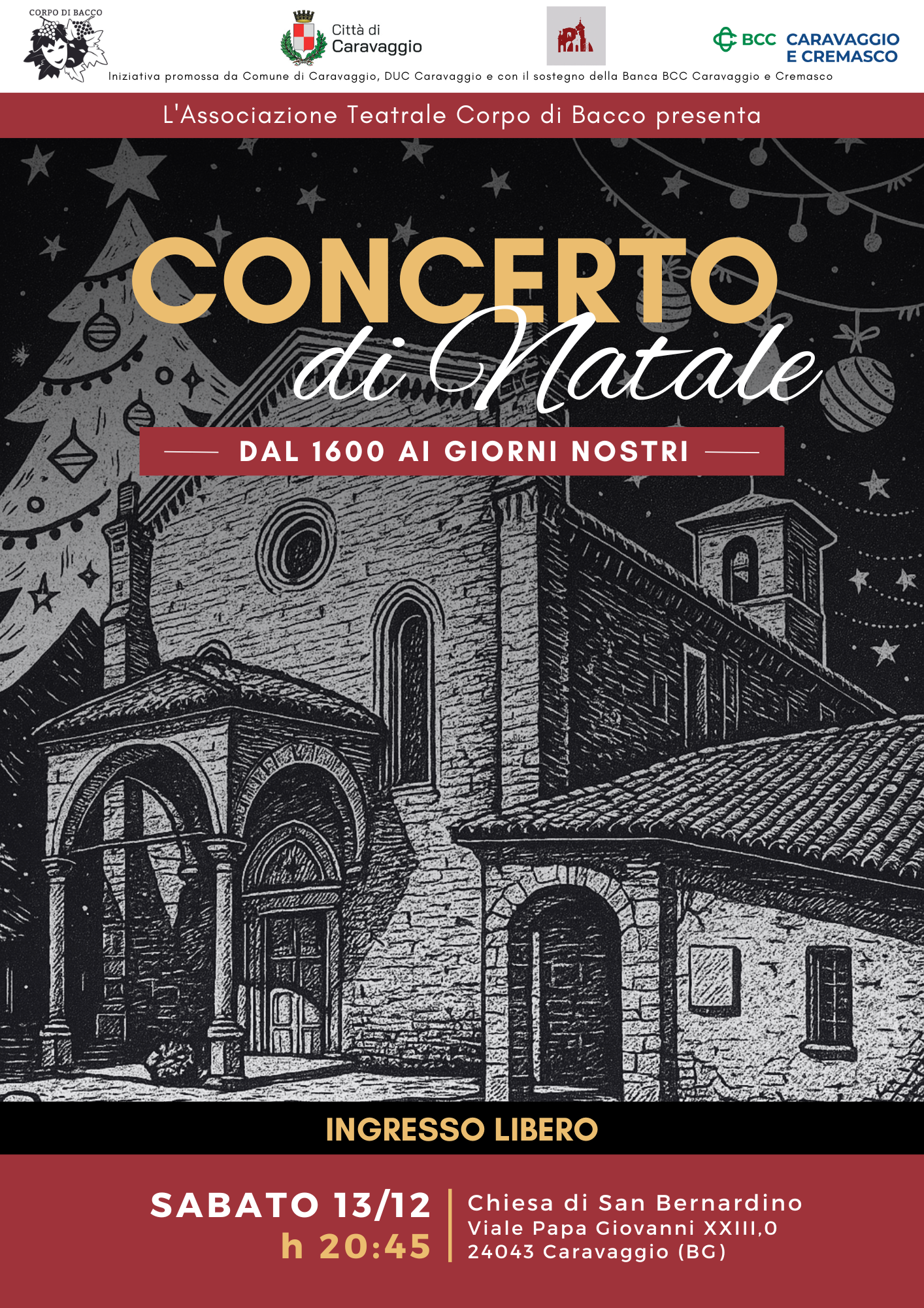 L'Associazione Teatrale Corpo di Bacco presenta il Concerto di Natale che si terrà preso la Chiesa di S. Bernardino domenica 13 dicembre alle ore 20:45.
