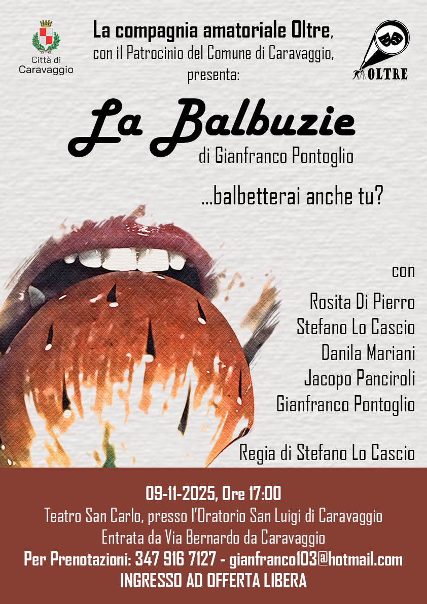La Compagnia amatoriale Oltre, con il patrocinio della Città di Caravaggio, organizza lo spettacolo teatrale "La balbuzie" presso il Teatro San Carlo dell'Oratorio di Caravaggio, domenica 9 novembre alle ore 17:00.
